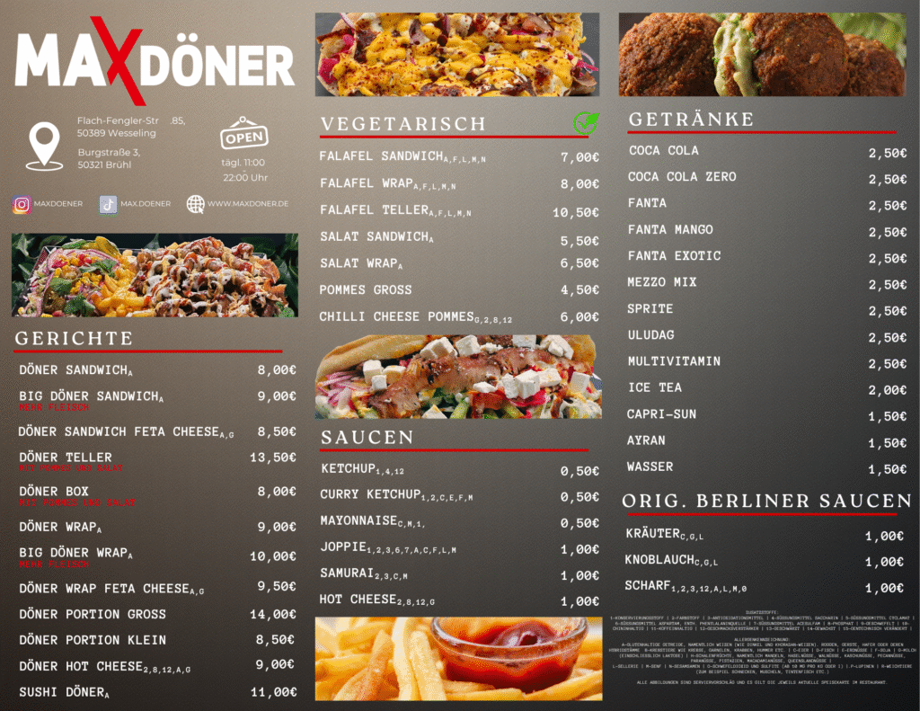 In unseren gemütlichen Filialen in Wesseling und Brühl laden wir euch herzlich ein, euer Essen direkt vor Ort zu genießen. Unsere Speisekarte ist so gestaltet, dass ihr schnell und einfach wählen könnt, um lange Wartezeiten zu vermeiden. Bei Max Döner stehen Freundlichkeit und exzellenter Service an erster Stelle. Kommt vorbei und lasst euch von unserer Leidenschaft für Döner begeistern!